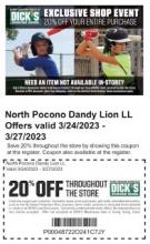 Shop at any Dick's location from 3/24/23 through 3/27/23 and use this coupon to receive 20% off your entire order!